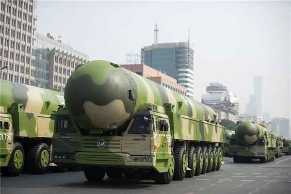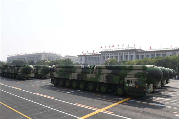 10月1日上午,庆祝中华人民共和国成立70周年大会在北京天安门广场隆重举行。这是受阅的东风-41核导弹方队通过东单路口。新华社记者 张豪夫 摄
