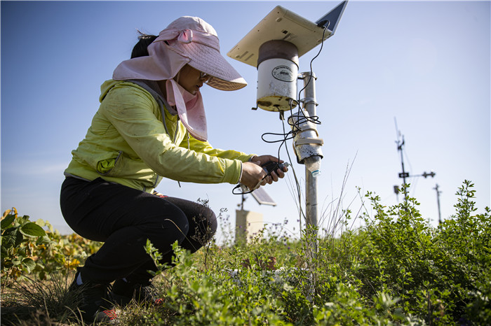 9月18日,博士研究生牛小桃在神木站的试验田下载翻斗式雨量计记录的降雨数据。陕西日报记者 赵晨摄