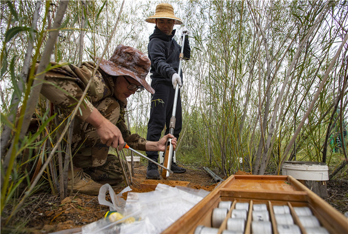9月20日,西北农林科技大学水土保持研究所研究员邓蕾和硕士研究生袁鸿猷(左)一起在神木站的试验田里打钻取土,分析土壤水分含量。陕西日报记者 赵晨摄