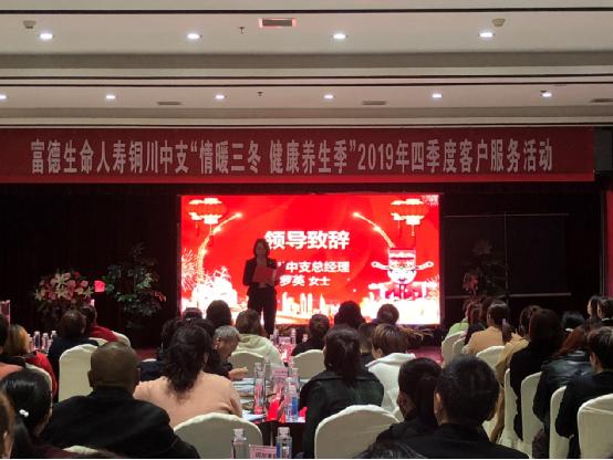 快乐保健、你我共享。2019年10月31日上午,富德生命人寿铜川中支“情暖三冬•健康养生季”2019年四季度客服活动在福楼大酒店成功举办,130余名新老客户应邀参加了此次活动。