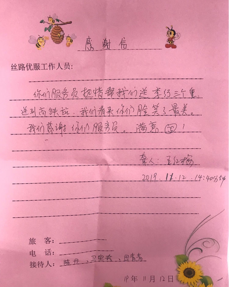 临别,虽然不能言语,受到帮助的旅客向工作人员竖起了大拇指,并递上一封感谢信表达他们的感激和称赞。信上写着“在我们看来,你们的笑脸最美!”(通讯员 王琨)