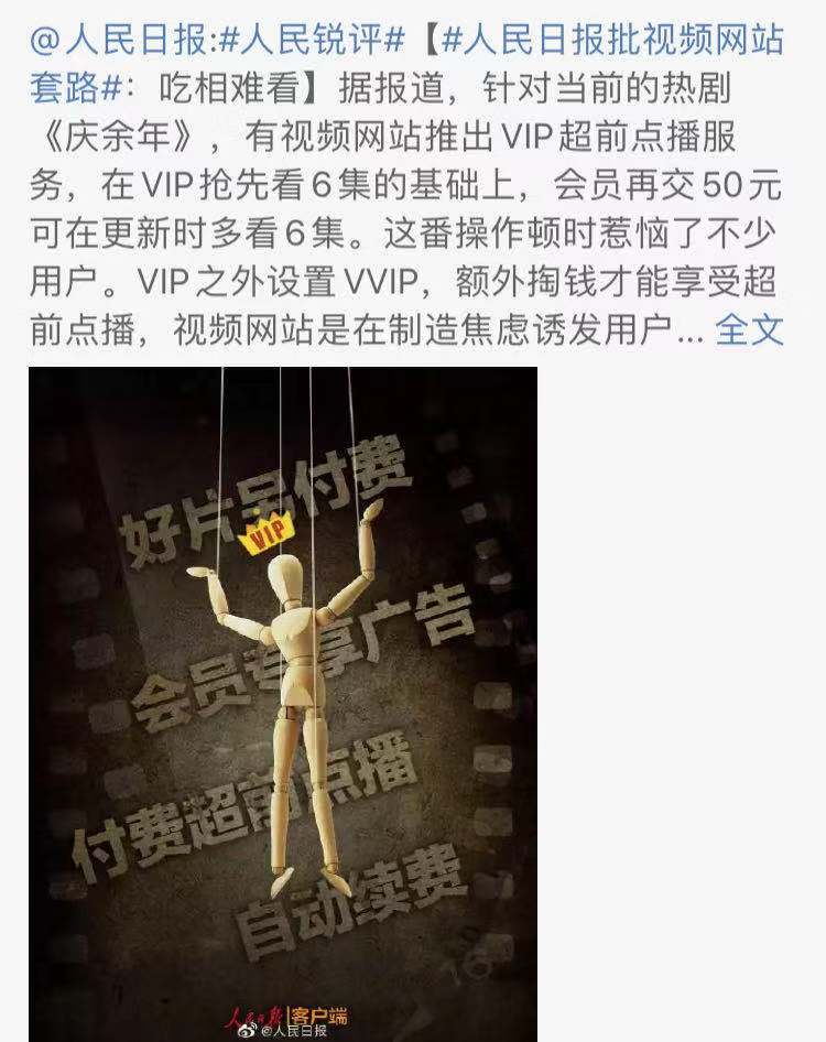 于是,在观众不断催更下,爱奇艺和腾讯视频两家平台均提前更新了6集,但却要求会员用户须另外开通“VIP付费超前点播”功能:在开通会员的基础上,另外付费50元才可以观看提前更新的6集电视剧。这一行为引发了观众的不满,有不少网友在社交平台上抱怨,“交了会员费既要看‘专属广告’,还要高价点播,我们VIP的钱是大风刮来的吗?!”《人民日报》也发表评论痛批视频网站“套路”吃相难看,质疑此类消费的权益保护是否存在漏洞,并称:这样的视频网站不能惯。