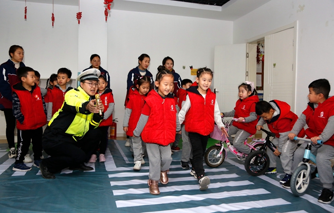 12月24日,渭南高新区北苑明德幼儿园,民警通过情景模拟的形式向小朋友讲解安全过马路知识。