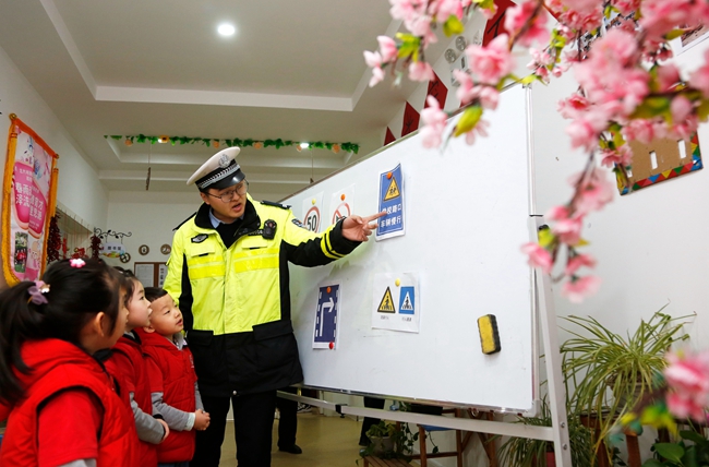 12月24日,渭南高新区北苑明德幼儿园,民警向小朋友讲解交通安全标志。
