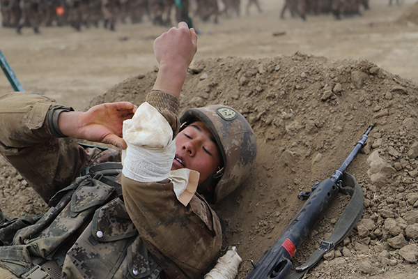“左大腿被炸断,形成残肢端!”验明伤情,包扎救治,训练场上示范兵的情况处置果断正确。从出发阵地到发起冲击,整个战场救护课目的示范内容完全融入实战背景。