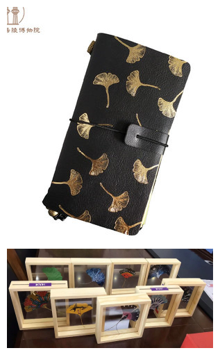 此外,设计师以汉阳陵内百亩银杏林的银杏叶为元素,以汉阳陵自有“银杏叶美术LOGO”,结合汉阳陵“春夏秋冬”四季制作不同内页颜色,再以牛皮为封面材质辅以烫金银杏叶,制作而成的手账本。还有以真实树叶为底,结合丙烯颜料、矿物颜料、装饰品等艺术创作而成的独一无二的“银杏画语”艺术摆台,也获得一致好评。