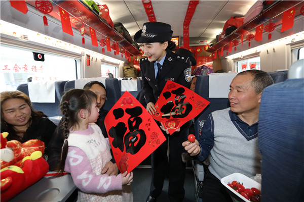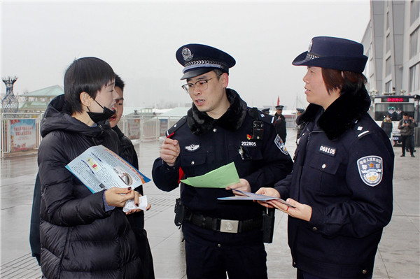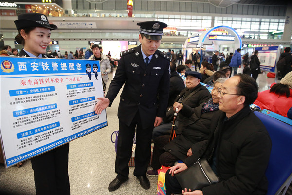 春运来临,西安铁路公安处民警加大铁路安全宣传,全力维护良好治安环境,广泛开展各类爱民服务活动,保障旅客平安出行。西安北所、华山北所、咸阳所民警加强车站广场、候车室、售票厅、站台等区域的安全宣传,通过表演小品、唱响安全歌曲等形式进行安全宣传。西安乘警支队民警走上高铁列车通过展板讲解为旅客讲解乘车安全, 丹凤所、耀县所、阎良所民警利用寒假之际,走进辖区村庄、学校进行路外安全宣传。福临堡所、略阳所、商南所、三原所组织民警在车站向旅客介绍微警务,讲解预防电信诈骗知识。西安铁路公安处民警在春运期间立足岗位,积极开展爱民、利民、便民等服务活动,尽力为旅客排忧解难。(通讯员 张鑫)