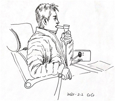 该手绘记录着西安市新城区太华路街道党工委书记王鹏边做雾化边继续坚持工作的场景 绘制 姜慧文