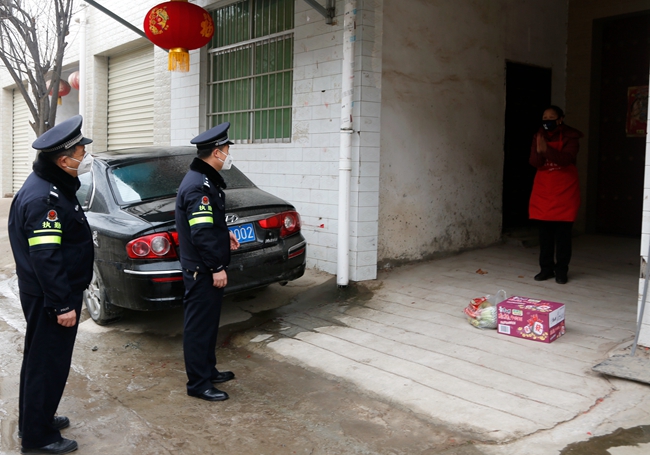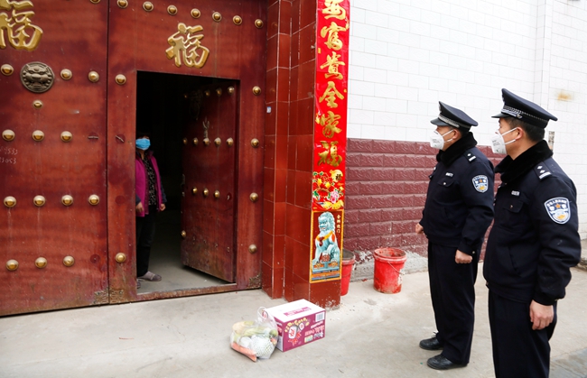 2月7日,渭南市临渭区双王社区,渭南市公安局临渭分局环北路派出所民警为武汉归来居家自我隔离的群众送去新鲜蔬菜,安慰其安心隔离,积极配合疫情防控工作。(通讯员 崔正博 )