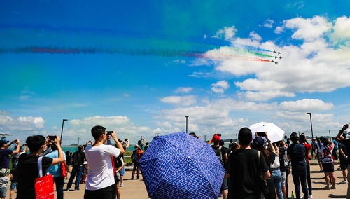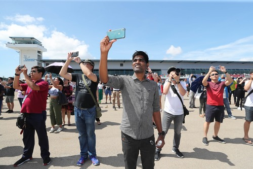2月15日,在新加坡航展首个公众开放日上,观众们拍摄飞行表演。朱姜海 摄