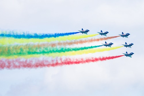 11时42分,八一飞行表演队6架表演机相继腾空而起,伴随着激昂雄壮的音乐,6架战机以“人字形”编队低空通场,天空中留下6道长长的彩烟。双机对头交叉、六机三角队俯冲、斜斤斗、五机水平向上开花、单机小速度平飞……整场飞行表演依次展示了六机、五机、四机、双机和单机的经典动作,赢得现场观众阵阵掌声。