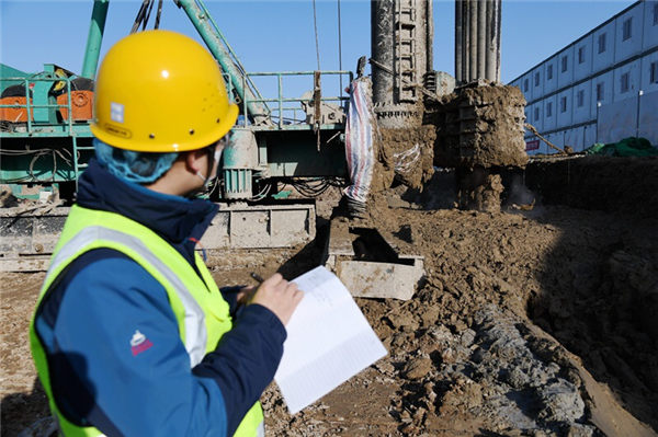 项目现场的管理人员王鹏介绍说,这台大型装备“五轴神器”从山西太原调度而来,约重280吨、主杆最高42米、桩长35米,其仅运输就需要8辆拖挂车完成,拉到项目后再进行技术组装。“五轴神器”经组装、调试后正式运行,一昼夜可打9幅桩,每幅桩长约2.4m,桩孔最大深度31.5m、直径约850mm;打桩实行跳打法,现场配备有专业管理人员进行技术指导和施工记录,保证止水帷幕按照高标准的质量安全要求完成。同时,“五轴神器”工作期间每幅桩孔加压灌注水泥约25吨左右,其配套的水泥搅拌站也在有条不紊地运行,四五辆装满水泥的泵车循环排队在路边待命为其蓄力增源。