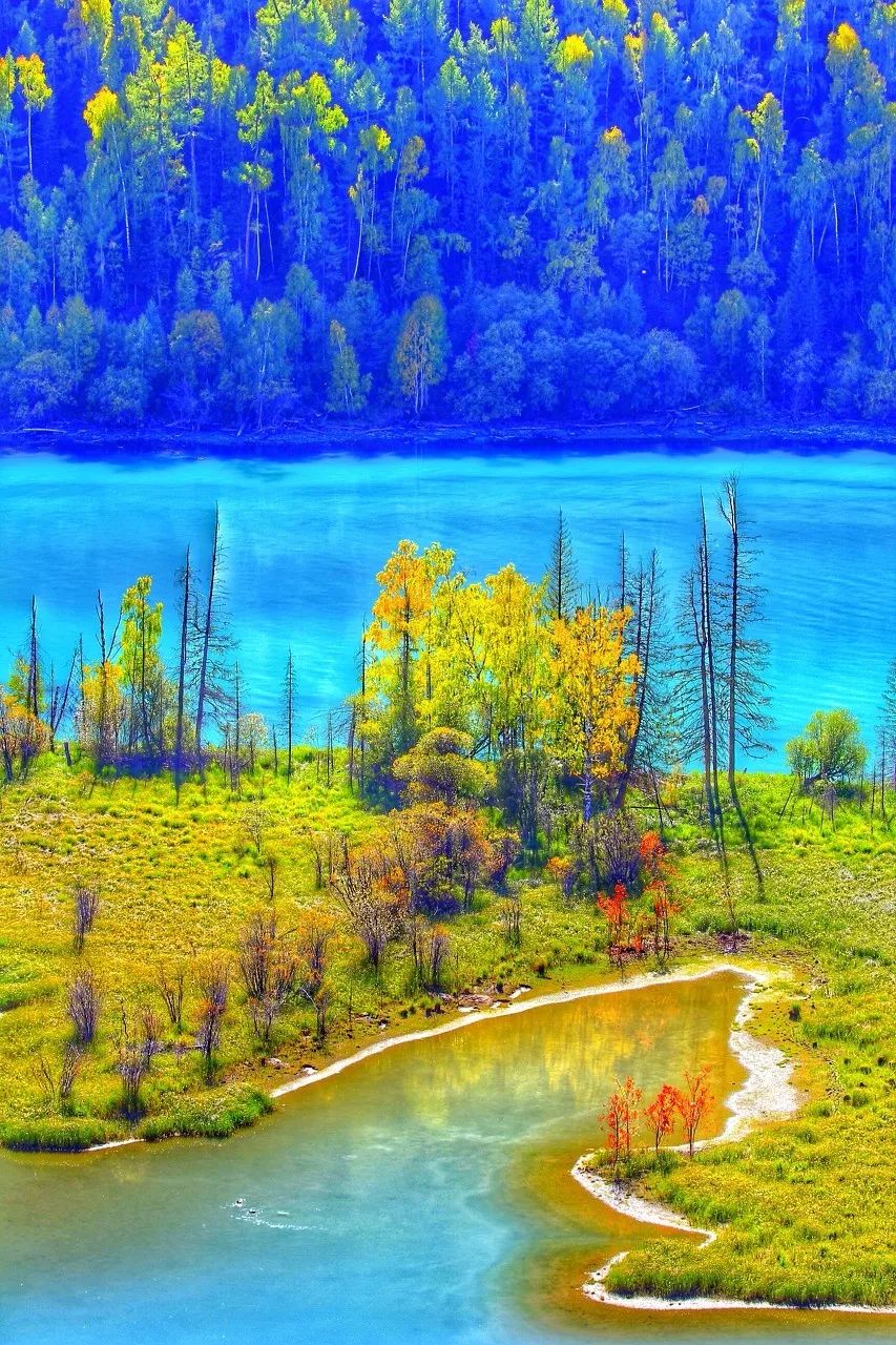 在一片金黄色里,喀纳斯湖如一个熟睡的圣婴,清澈的双目,似蔚蓝的湖水,呈现神秘梦幻般的色彩。