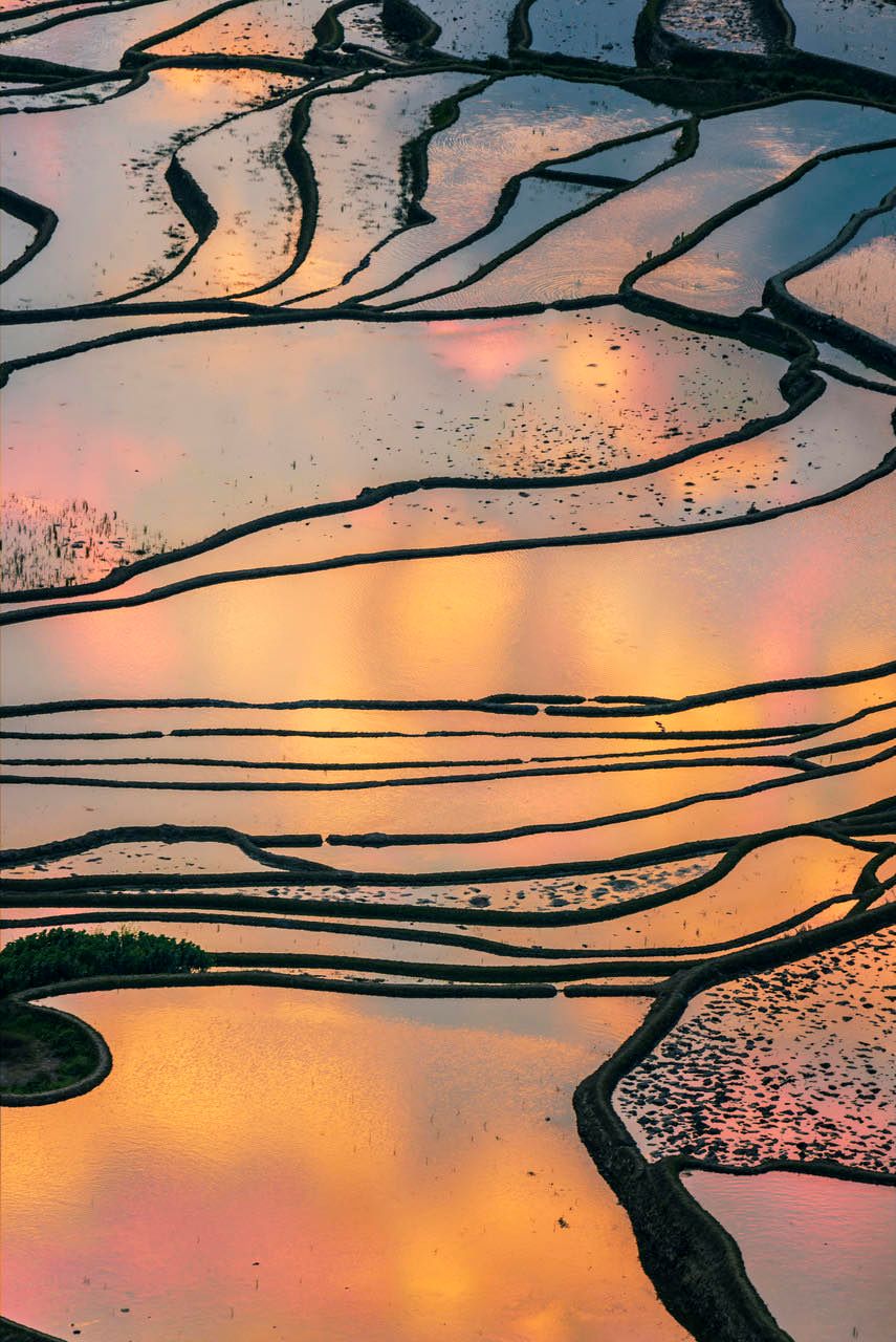 灌水期的元阳梯田,层层叠叠的水面,倒映着白云蓝天,树木山川,像极了一块块精美的彩色玻璃。