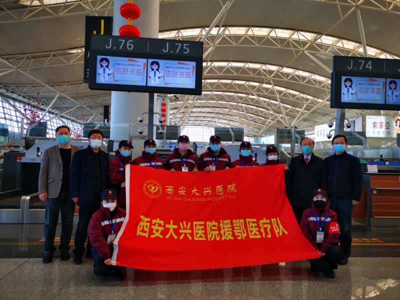 2月2日,陕西省第二批赴鄂医疗队出征仪式在西安大兴医院隆重举行,陕西省委副书记贺荣到院为医疗队送行。在这次支援中,西安大兴医院克服人手少、任务重的各种困难,主动派出26名医务人员,奔赴武汉支援防疫工作。26名医疗队员,党员10名,博士后2人,博士3人,硕士2人,2人担任医疗队医疗副组长和护理副组长,是派出医疗队员最多、技术力量最雄厚的医院。