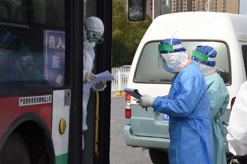 2月19日,一辆转运确诊患者的公交车抵达武汉市泰康同济医院,军队医护人员上前核对患者信息。新华社记者 黎云 摄