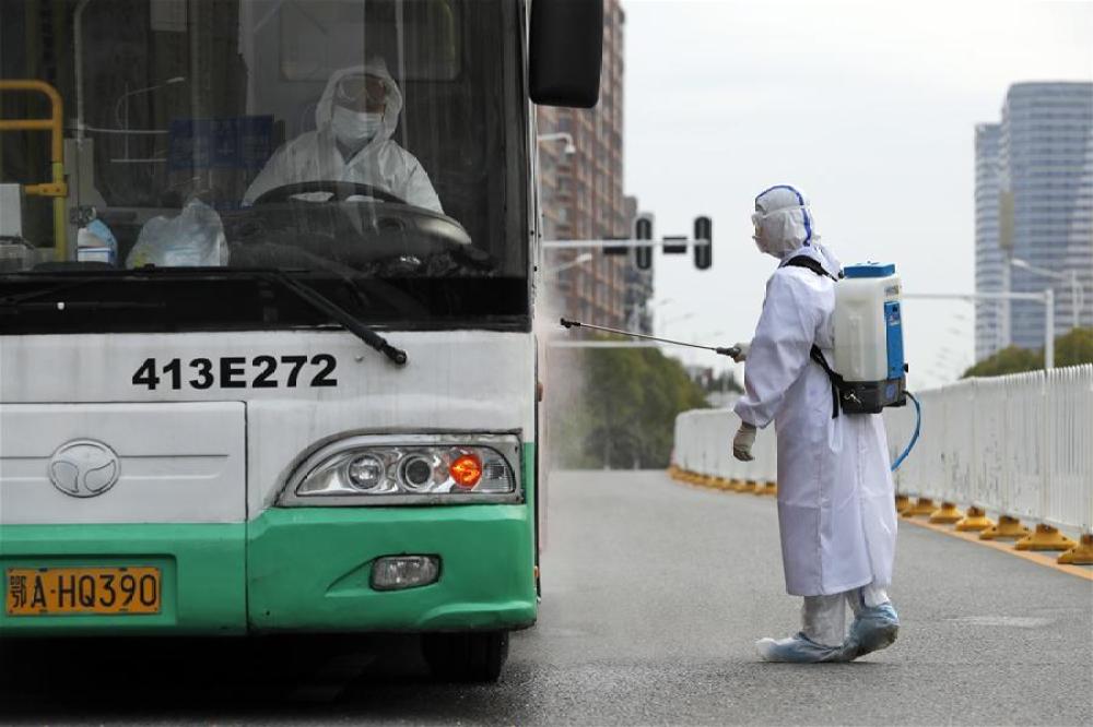 2月19日,在武汉市泰康同济医院,医护人员为运送患者的车辆消毒。新华社记者 沈伯韩 摄
