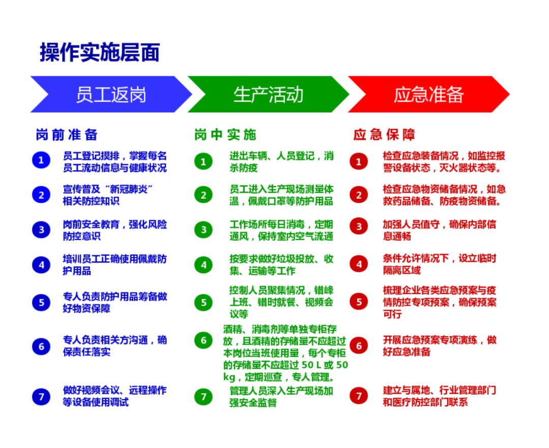 企业应周密制定“一企一策”复工方案,在制度和操作两个层面,从员工生活和生产活动等方面明确管控要求并采取有针对性的管控措施,同时做好特殊时期的应急准备。管控重点提示如下: