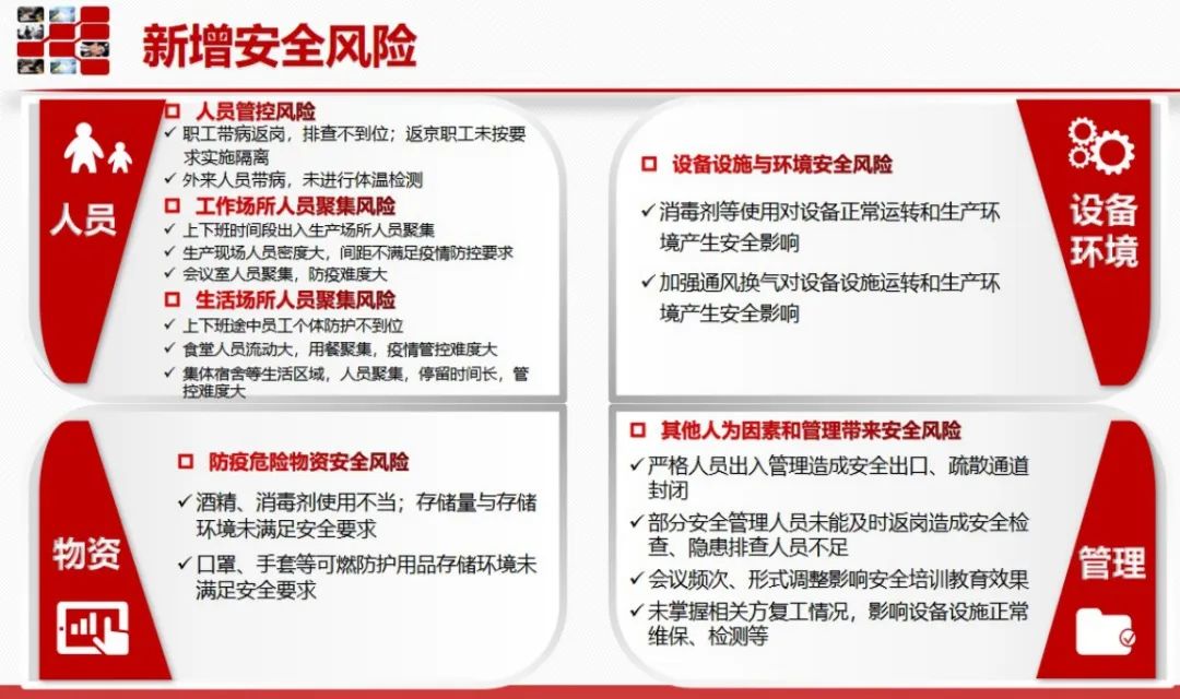 在当前疫情形势下,新增风险主要包括:人员管控风险(内部职工和外来人员);工作场所人员聚集带来的疫情传播与扩散风险;生活场所人员聚集带来的疫情传播与扩散风险;新增的防疫物资(酒精、消毒剂等)使用、储存过程中的燃烧、氧化、腐蚀等风险;生产环境变化(通风、消毒等情况)导致的风险;其他人为因素和管理带来的风险。
