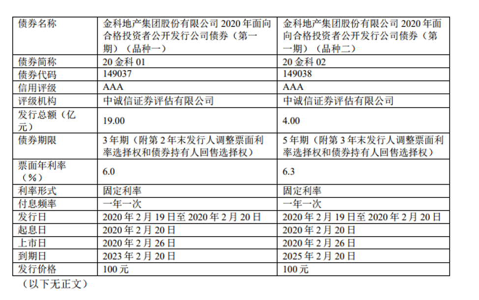 2月25日晚间,金科股份(000656.SZ)也发布2020 年面向合格投资者公开发行公司债券(第一期)在深圳证券交易所上市的公告。本次发行总额共23亿元,品种一为3年期6%利率19亿元,品种二为6.3%利率5年期4亿元,债券将于2月26日上市。
