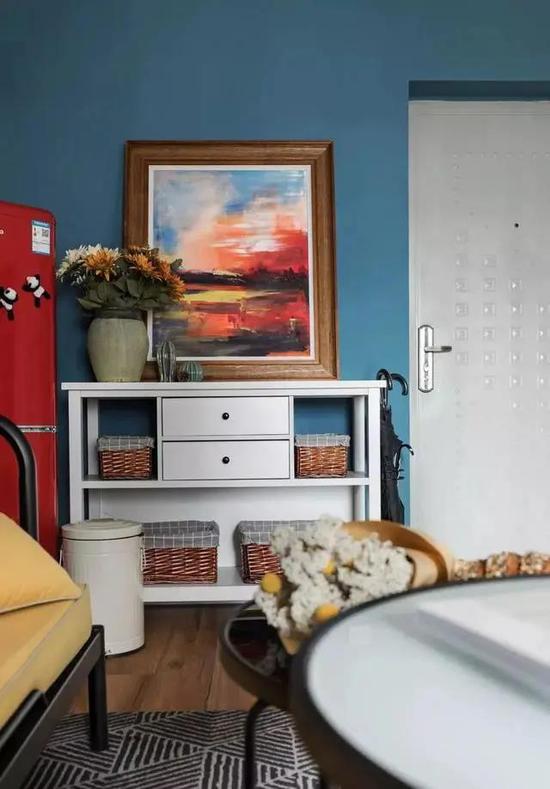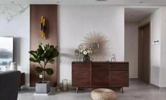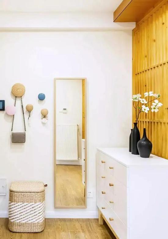 无玄关的家,除了美化入户区以外,还可以在第一眼墙面上下点功夫,巧妙地聚焦视线。