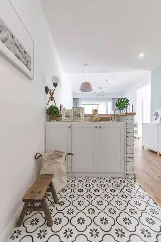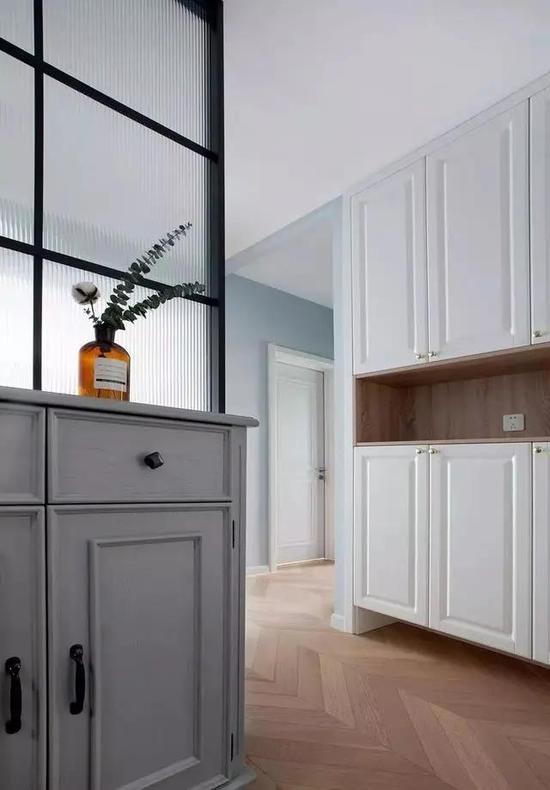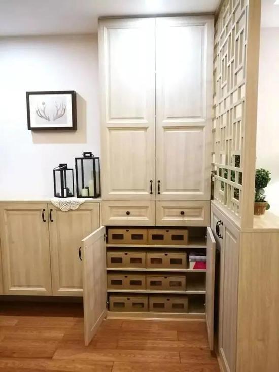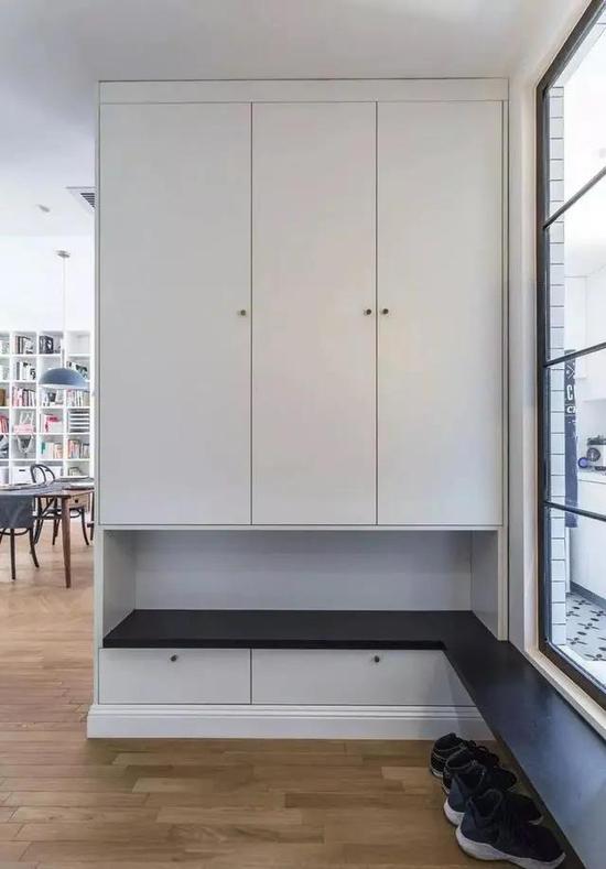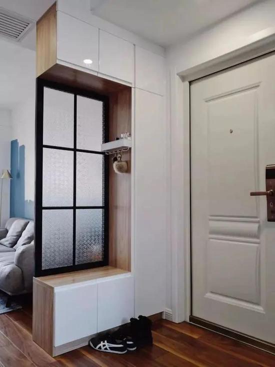 利用鞋柜当隔断,即起到了阻挡视线的作用,也增加了换鞋、收纳的实用功能。