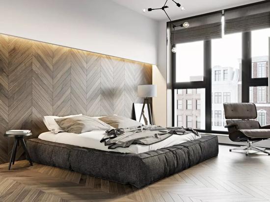 木地板上墙的设计是近几年比较火的背景墙装饰方案,把卧室的墙面铺上和地面相同的木地板,打造出一个温馨而又舒适的卧室空间。