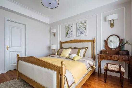 在美式风的卧室当中,我们可以经常看见石膏线装饰边框的设计,简洁的石膏线让卧室变得更有层次感,又不会太过复杂。
