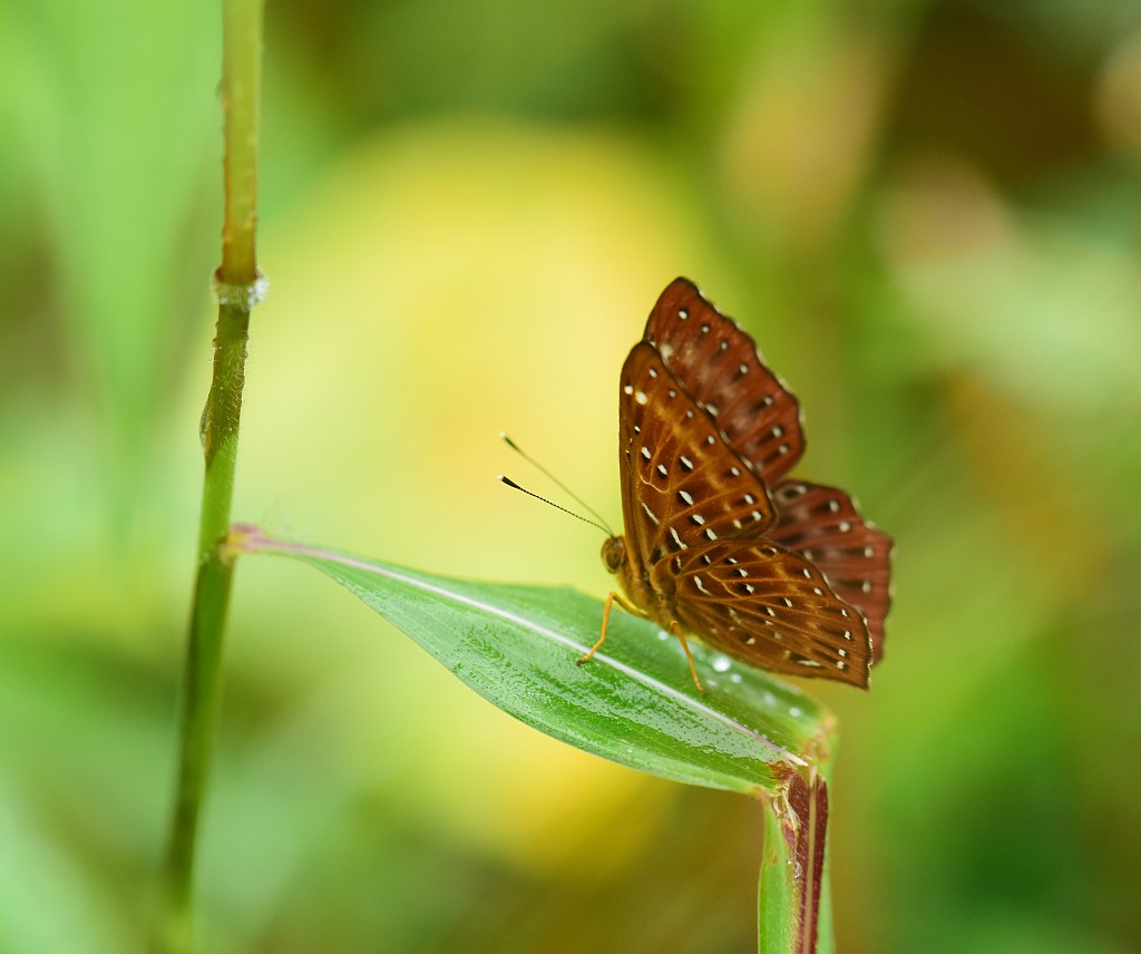 惊蛰节气过后,海南绵绵春雨下个不停,琼海万泉河畔雨雾迷蒙,花草上挂满晶莹的雨珠,处处呈现烟雨江南的意境。在海南琼海万泉河畔,一只蝴蝶在湿润的叶子上停留。