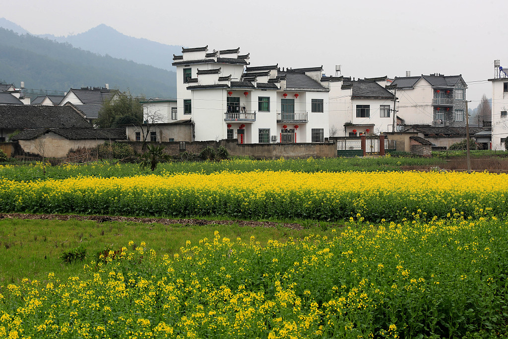 在安徽黄山,齐云山脚下环居村盛开金黄的油菜花与徽派民居交相辉映,宛若一幅刚刚画就的江南山水画。