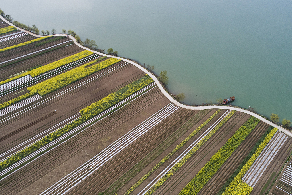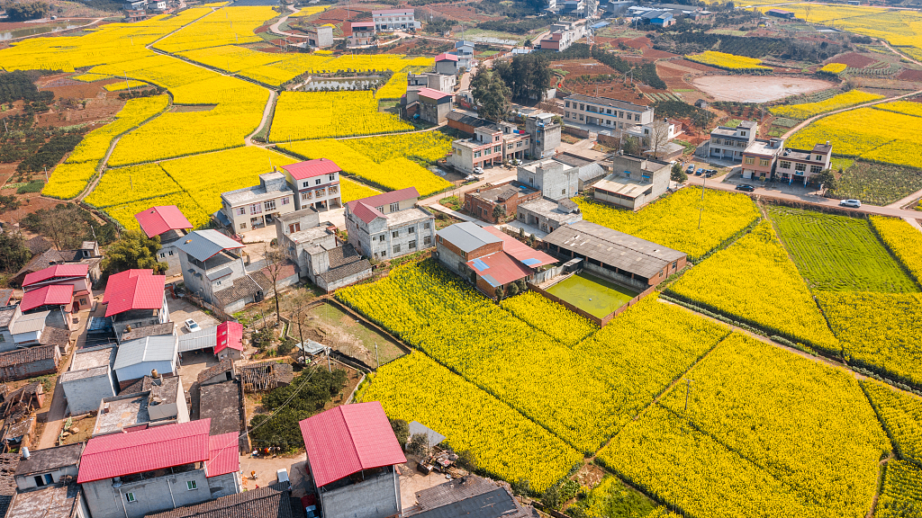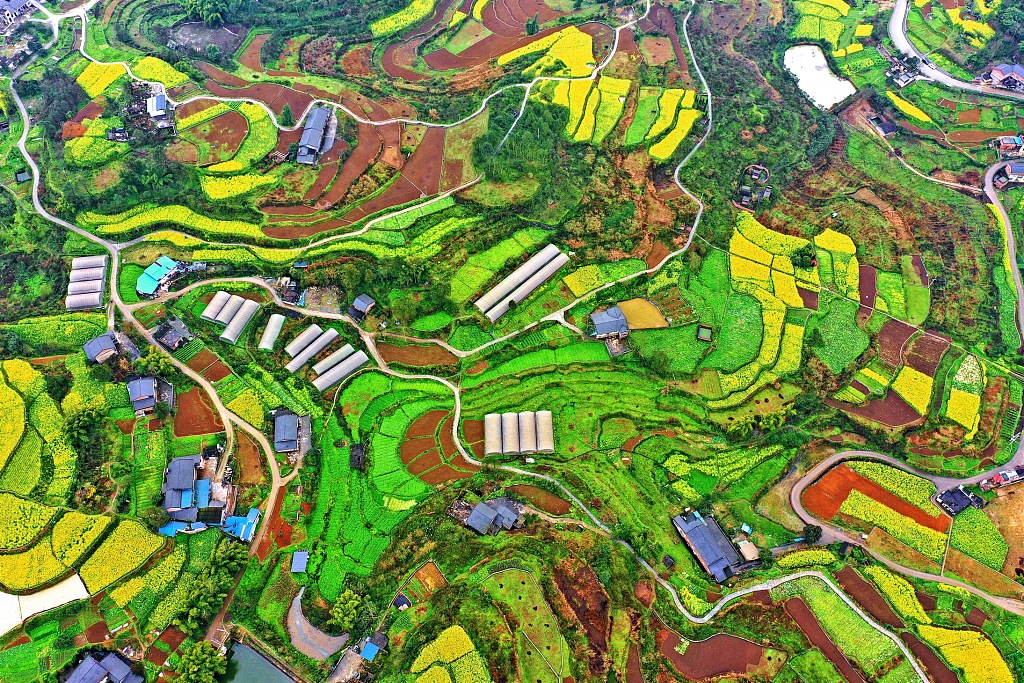 重庆市万盛经开区丛林镇新建村,金灿灿的油菜花次第开放,与农房、池塘、蔬菜大棚、田间便道相映成趣。