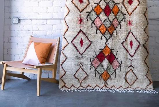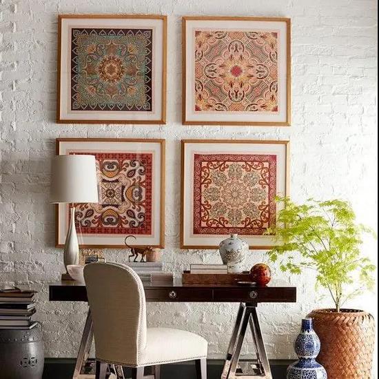 如果您有一块珍贵的地毯,过于精致而不舍得铺在地上踩踏,那就把它挂起来。为避免用钉子固定而损坏织物(和墙壁),您可以选择维可牢尼龙搭扣,这样不仅可以隐藏支撑节点还不会损坏织物。