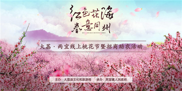 3月21日至3月22日,为期两天的红色花海、春意同州”大荔·两宜线上桃花节暨招商助农活动成功举办,与往届线下桃花节不同是,本届两宜镇桃花节首次以线上“云直播”的形式,举行两宜镇网络招商推介会暨水果订购签约仪式与线上主播直播游两宜活动。本次活动线上吸引累计25万多人次场外人员的观看,足以可见活动内容丰富多彩,形式创新。