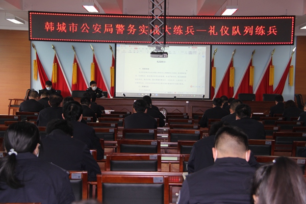 从3月23日开始,韩城市公安局组织全局实战小教员开展礼仪队列练兵,贯彻落实省厅、市局关于开展全警实战大练兵的安排部署,全面提升公安队伍“五个能力”,着力锻造一支“四个铁一般”的让党放心、让人民满意的高素质过硬公安队伍,全体局党委班子成员参加了讲座。