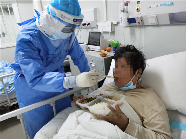 距离早饭时间还有三个多小时,老太太等不到吃早饭的时间就会低血糖了。护士金蕴韬转身跑去拿自己带进“红区”的八宝粥,用开水烫热后,来到老奶奶床旁,一口一口喂她吃下。