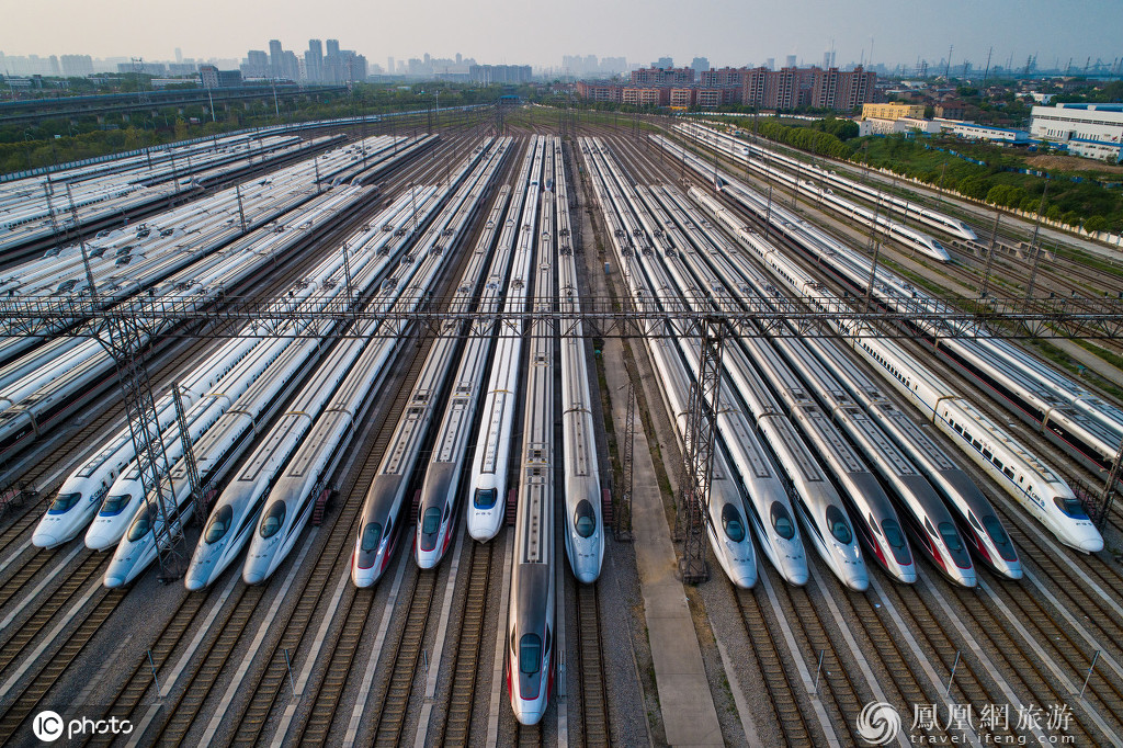 4月7日,航拍武汉动车段近百组动车组整齐停放蓄势待发,静待武汉“重启”,只等“扬帆起航”。
