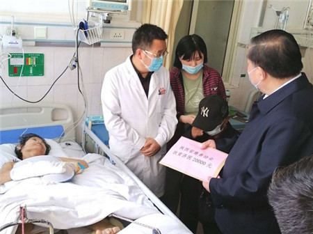 在听取了西电集团医院党委书记陆键安、社区党委书记周健玲的情况介绍后,吴前进说,刘九一家是一个特殊的家庭,省慈善会要协助残联、社区联手帮助刘九一家治病,解决他们生活上的困难。今天代表爱心网友送来2万元的捐款作为他们的生活费,后续治疗费用的拨付由当地社区负责监管,按进度分期拨付到医院。他希望残联和社区能落实各项政府救助政策,帮助刘九的女儿就业,医院应尽全力对陈玉霞进行救治。他还鼓励刘九和女儿要树立信心,护理好患者,积极配合治疗,渡过难关。