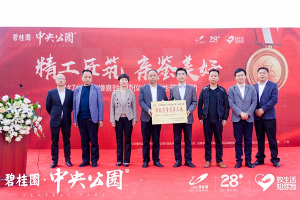 匠心研制,精工打磨,4月25日,兴平碧桂园·中央公园“匠心精筑 亲鉴美好”喜封金顶仪式暨工地开放活动盛大举办。兴平市公积金中心主任赵文歌、兴平市自然资源局副局长任军委、兴平市公积金中心信贷科科长南永峰、兴平市住建局建管科副科长刘凯、碧桂园陕西区域西北片区总经理闫军旗、碧桂园陕西区域西北片区营销总监景雅、碧桂园陕西区域西北片区运营管理部负责人张军伟、兴平碧桂园中央公园项目总经理杨洪焦、兴平碧桂园中央公园项目承建方负责人孙领库以及近百名业主代表们亲临现场,共同见证碧桂园匠心品质!到场的领导向兴平中央公园项目一期一标段工地授予了“市级质量观摩工地”的牌匾。