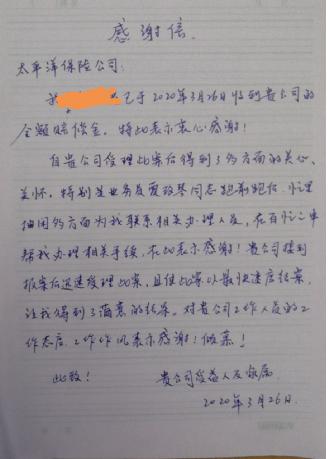 3月26日,中国太保寿险陕西分公司渭滨支公司收到一封客户发来的感谢信。