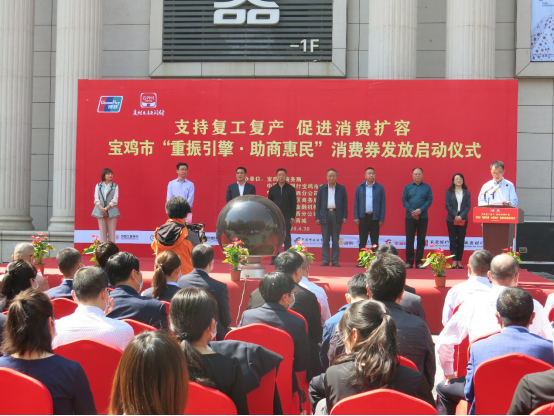 陕西传媒网讯(记者王皓 通讯员李芳)4月30日上午,由宝鸡市商务局、人民银行宝鸡市中心支行和中国银联陕西分公司主办的“支持复工复产,促进消费扩容”宝鸡市“重振引擎,助商惠民”消费券发放启动仪式,在宝鸡市开元商城广场举行。宝鸡市政府、人行宝鸡中支和中国银联陕西分公司等部门领导出席。宝鸡市各银行业金融机构、非金融支付机构和企业代表共计50余人参加活动。