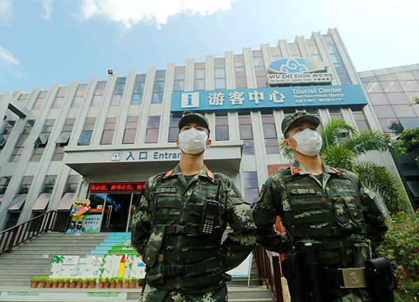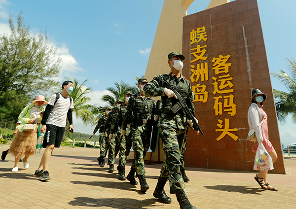 “五一”期间,武警海南总队三亚支队执勤官兵在蜈支洲岛旅游景区客运码头武装巡逻防控。周奕 摄
