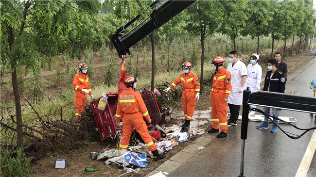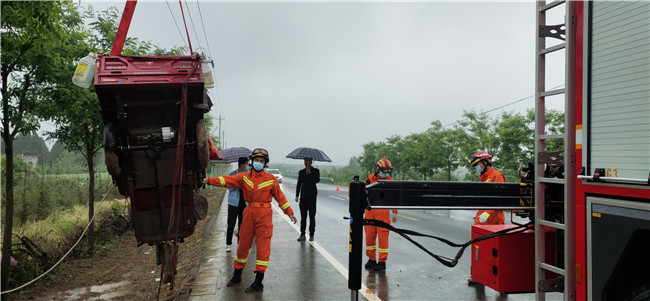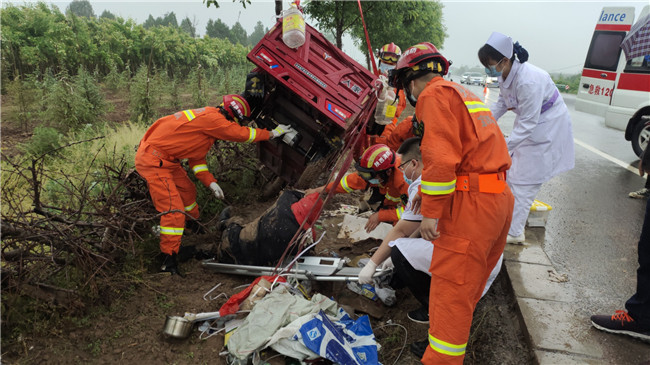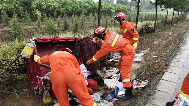 5月7日15时,宝鸡扶风消防救援站接警称城关镇南佐村三轮车侧翻,一人被困。