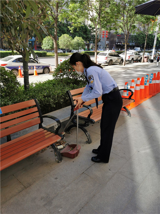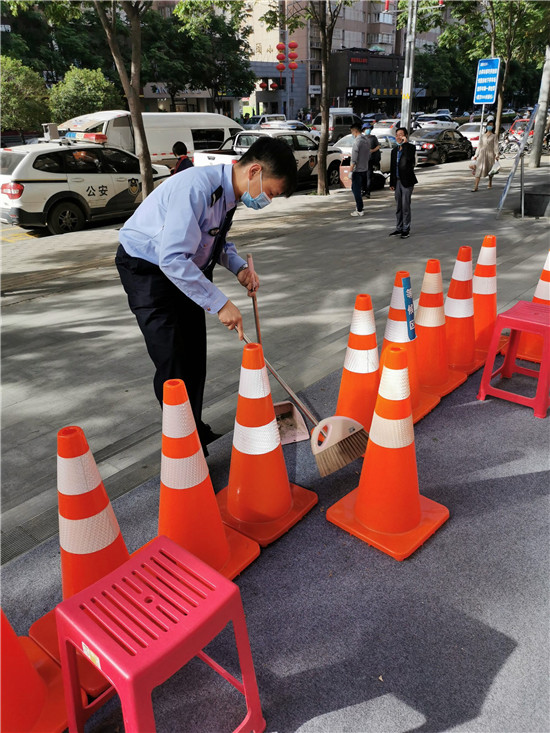 西安曲江大队法制中队组织人员分工合作,认真打扫大厅内外卫生,擦拭隔离墩、群众等候休息的长椅、24小时自助处理室,确保警务大厅整体环境干净整洁,保障办理业务的群众身体健康安全。