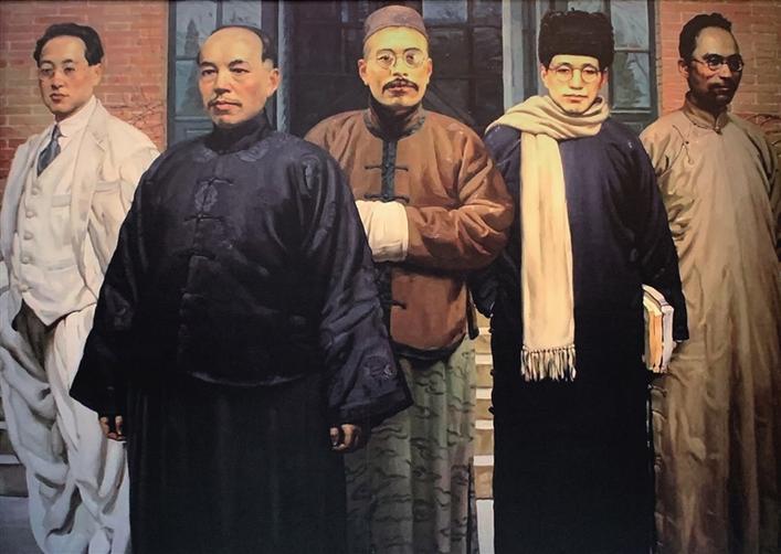 油画《国学研究院》(左起赵元任、梁启超、王国维、陈寅恪、吴宓)。