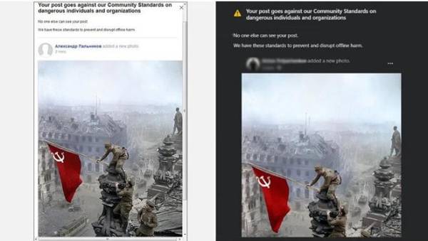 就在今年5月9日这天,俄罗斯人奥尔加•什尔妮娜将当年苏联红军把国旗插上柏林国会大厦的经典历史照片上色,并上传到了自己的脸书(Facebook)账号。脸书管理系统很快以“违反社区规定”为由,将她的账号封禁了3天。