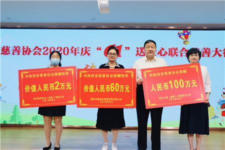 这次“六一”送爱心联合慈善大行动,陕西延长石油集团有限公司捐赠慈善救助基金增值款100万元、榆林市榆阳区姿樾商贸有限公司捐赠价值60万的澳绒三件套、陕西红星美羚乳业捐赠价值32.6万元食品、西安银桥乳业公司捐赠价值2万元牛奶;另外,各市慈善组织自筹善款共同慰问贫困家庭儿童2万名。与会领导现场向参加启动仪式的小朋友送上节日礼物,省慈善协会向西安中医脑病医院捐赠了价值35.227万元的抗疫物资及食品。