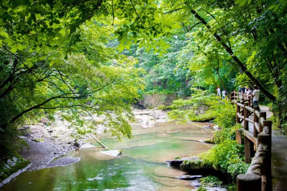 和别的避暑地不同,这里周末都很清静,游客不会很多,周围是郁郁葱葱的树林,弯曲的河水围绕着整个景区,一看就凉快。