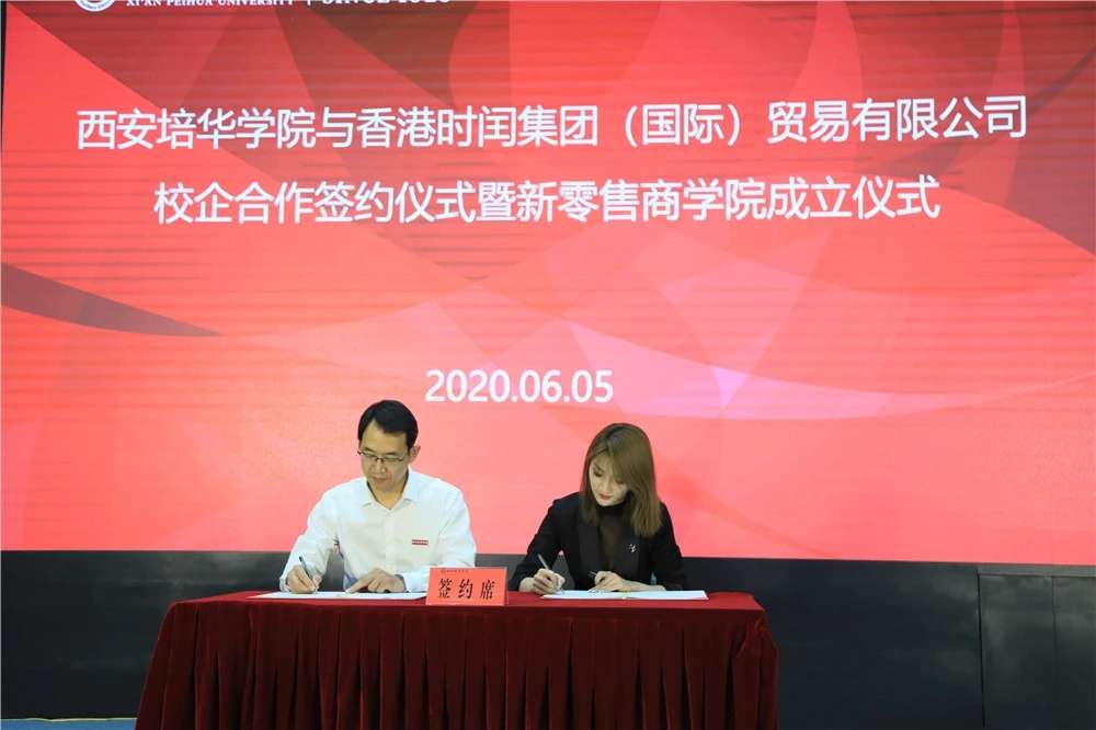 6月5日,为进一步实现企业人才培养及再就业、打造校企合作,人才输送的战略规划,西安培华学院与香港时闰集团(国际)贸易有限公司校企合作签约仪式暨新零售商学院成立仪式在西安培华学院举行。香港时闰集团执行董事郭飞、香港时闰集团执行董事助理王丽娜、香港时闰集团副总裁高健珲,西安培华学院理事长姜波、校长助理秦海锋、会计与金融学院副院长孙文琳、传媒学院副院长赵伟及各学院师生共同见证了此次签约仪式。