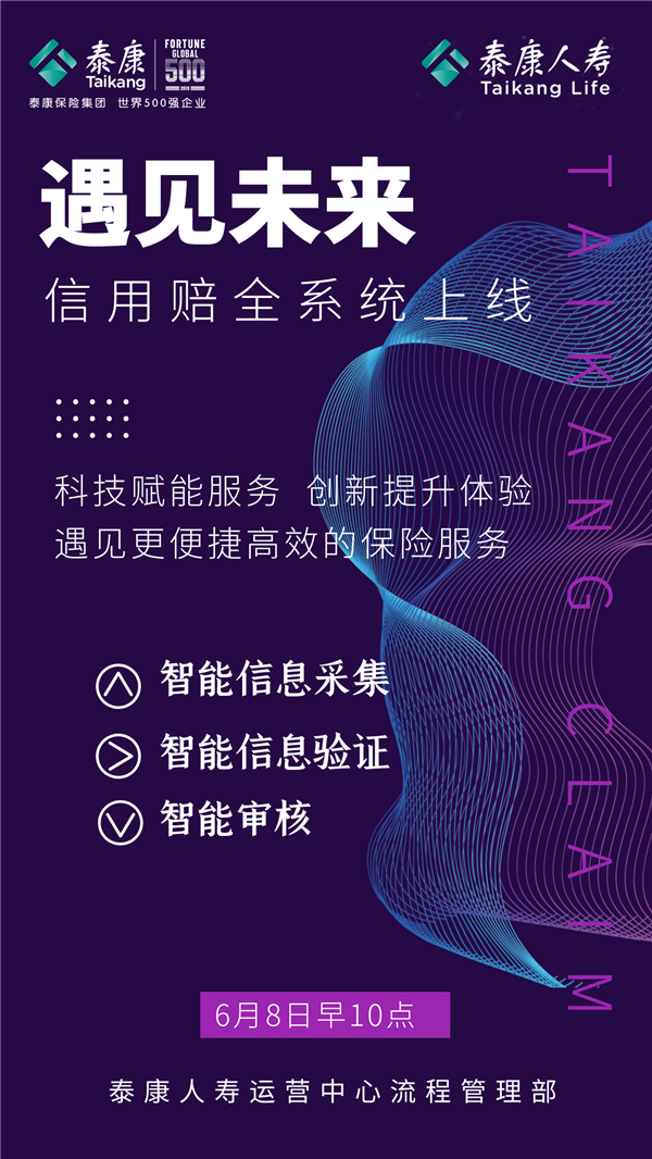 6月8日,泰康人寿在全国上线理赔服务新模式——“信用赔”,行业首创无人工理赔技术,为客户带来极速理赔体验。目前信用赔应用于住院补贴型健康险,未来将推广到其他健康险产品。
