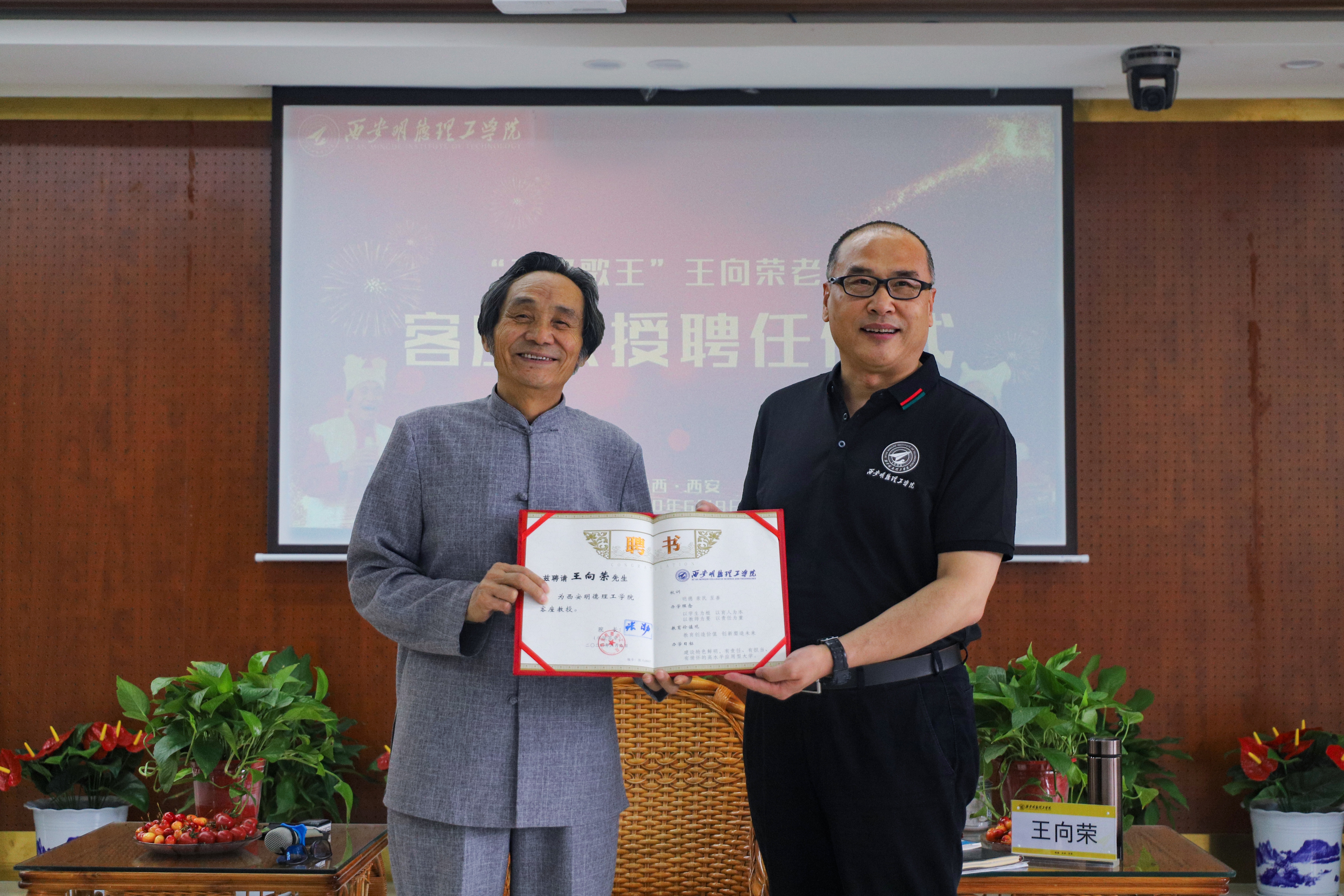 校长张渤向王向荣老师颁发了聘书,聘任王向荣老师为西安明德理工学院客座教授。
